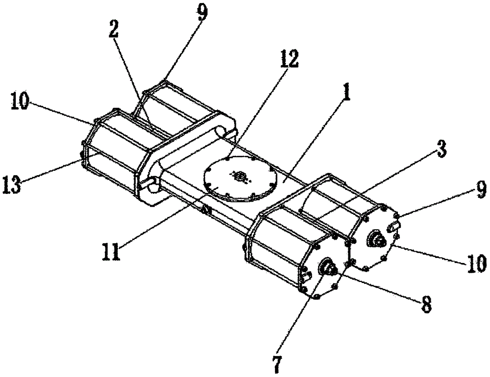 本實用新型工作原理:使用時,通過設置的主齒輪14開始轉動,通過設置在其上的若干組鋸齒以及第一活塞桿4和第二活塞桿16上的凹槽組合運動,并使設置的第一活塞桿4和第二活塞桿16反向運動,從而帶動活塞組件5在第一氣缸組2和第二氣缸組3內部進行往返運動,調節內部氣壓為整體裝置提高原動力,且通過設置的上蓋11和上蓋螺釘12便于用戶對執行器主體1進行安裝和拆卸,并對其內部進行檢修和零部件的更換,同時通過設置的拉桿13和拉桿螺母9便于將端蓋10和第一氣缸組2、第二氣缸組3進行固定安裝,從而大大增加了其穩固性,于此同時,通過設置的調節螺母7和調節螺栓8具有調節精度高的優點,整體裝置結構簡單,性能更穩定、調節精度高以及輸出扭矩平穩,具有一定的推廣價值。